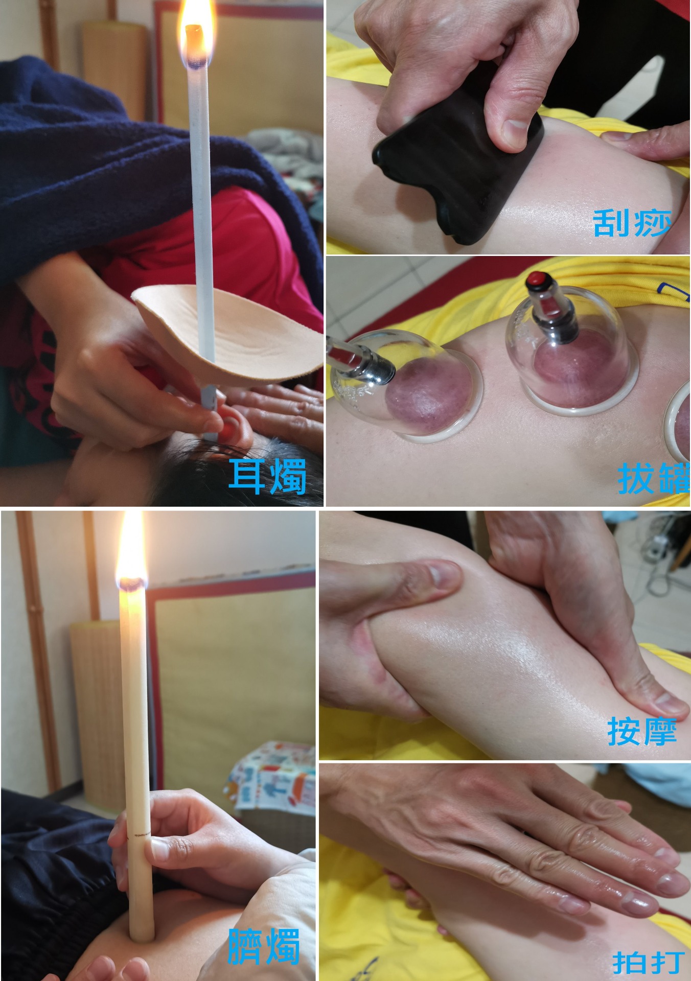 運用手法:手法包括刮痧、拔罐、按摩、推拿、拍打等不同技法。各技法的使用,將依身體各部位氣血不暢的深淺、位置,以及被施作者的偏好與需求,交叉運用。